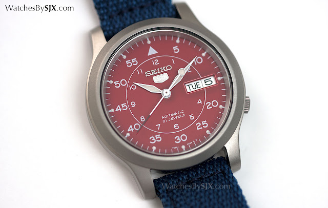 Automatique et inspiré par les Baumuster B cadrans de Beobachtungsuhr (montres d'observation) utilisés par les aviateurs allemands Seconde Guerre mondiale, la Seiko coûte 5 militaire aussi peu que 50 $ US - ce qui en fait l' un des tous les temps grands achats dans les montres mécaniques. La Seiko 5 Military est maintenant également disponible avec un cadran inhabituel rouge, une édition spéciale qui est, de façon assez surprenante, exclusive à Amazon (réf. SNKM95).